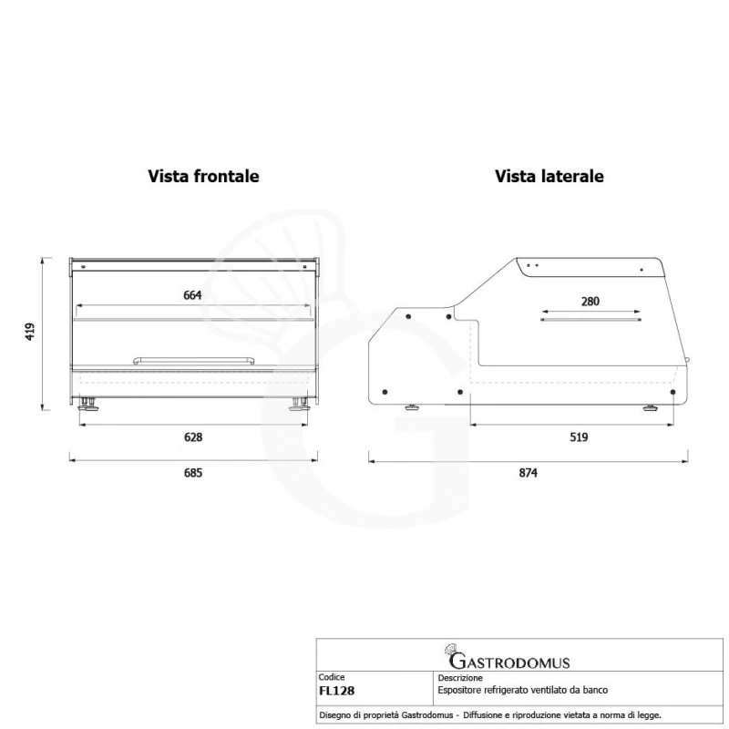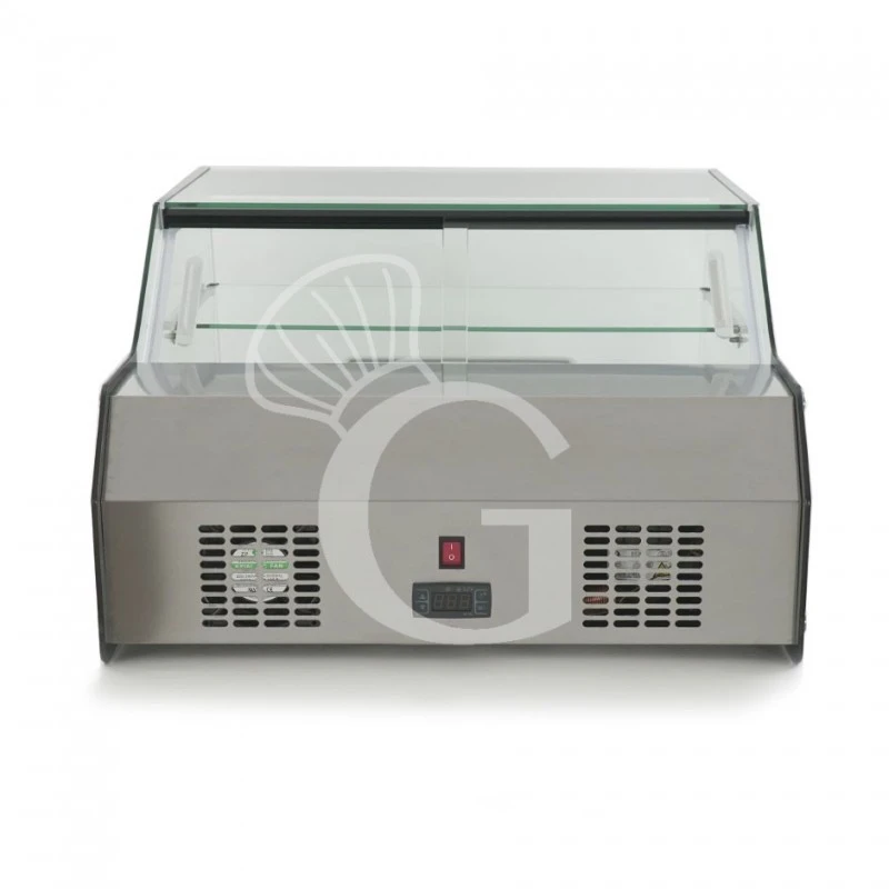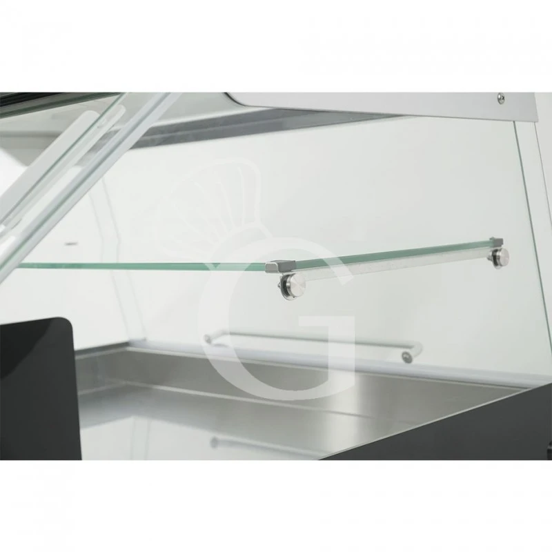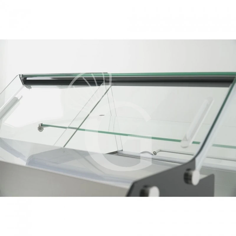 La vetrina espositiva è realizzata in vetro, acciaio inox e profili neri: è dotata di vetro frontale dritto apribile, per permettere al cliente di prelevare facilemente i cibi, mentre il lato operatore è aperto.