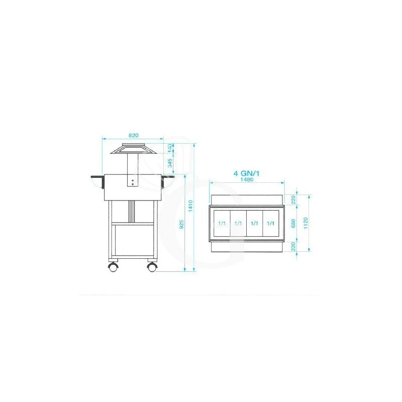Predisposto per 4 bacinelle GN1/1 di altezza 150 mm. (Bacinelle escluse).