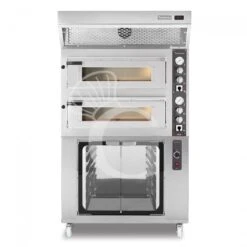 Forno Elettrico 2 camere per 4+4 pizze Ø 350 mm, controllo meccanico, cappa a condensazione inox e cella di lievitazione inox.