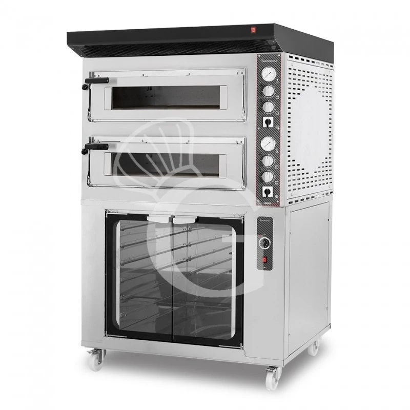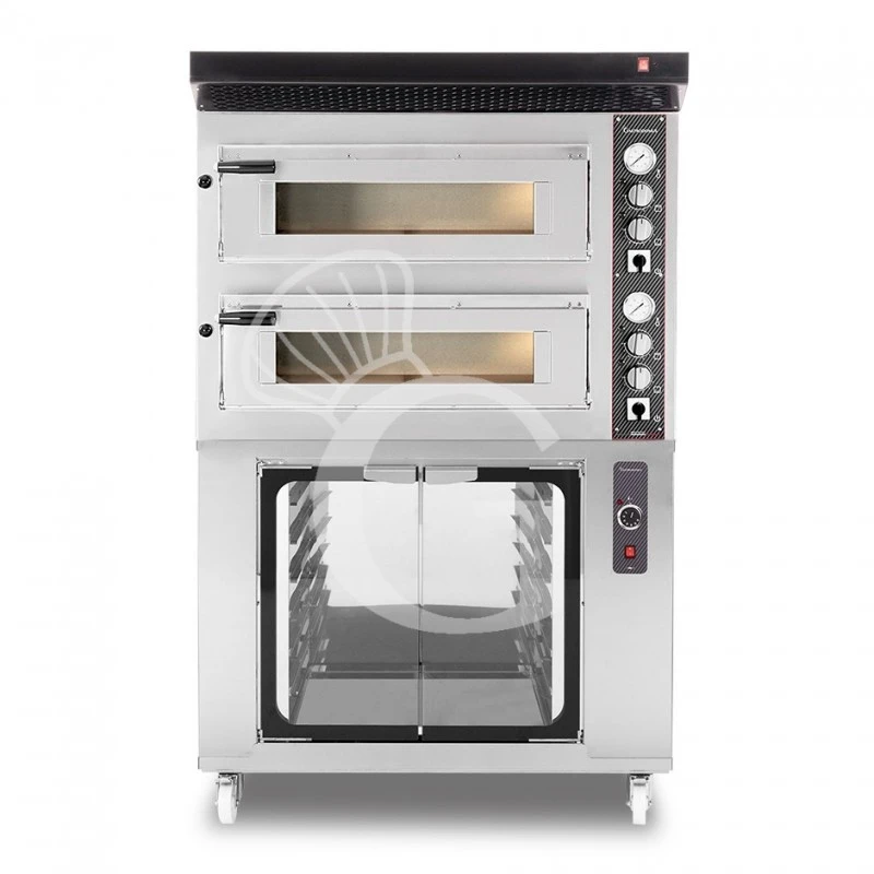 Forno Elettrico 2 camere per 4+4 pizze Ø 350 mm, controllo meccanico, completo di cappa nera e cella di lievitazione inox.