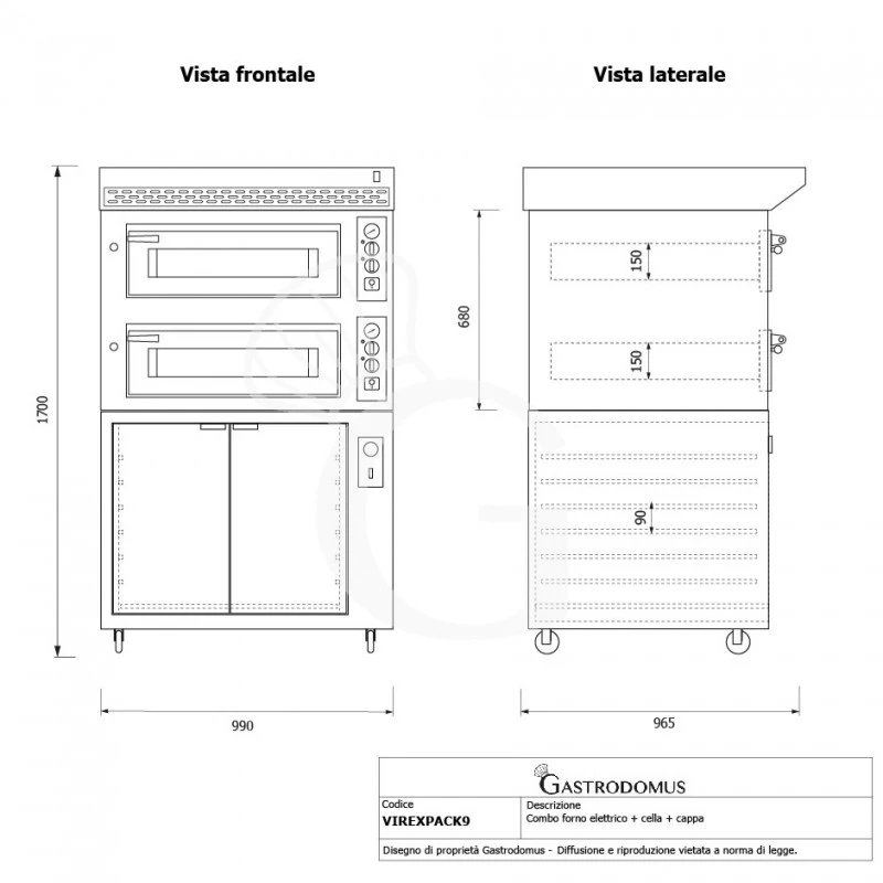 Il forno è completo di cella di lievitazione inox e di cappa aspirante nera dotata di motore e regolatore.