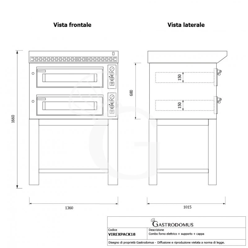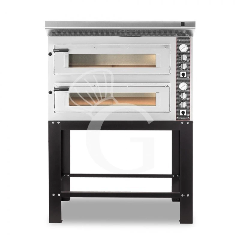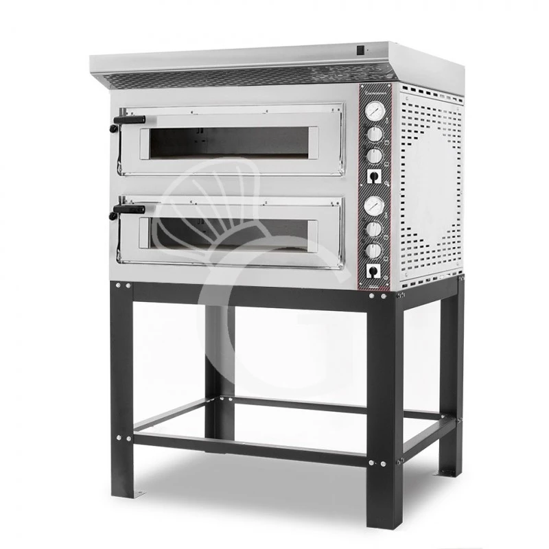 Forno Elettrico 2 camere per 6+6 pizze Ø 350 mm, controllo meccanico, completo di cappa inox e supporto.