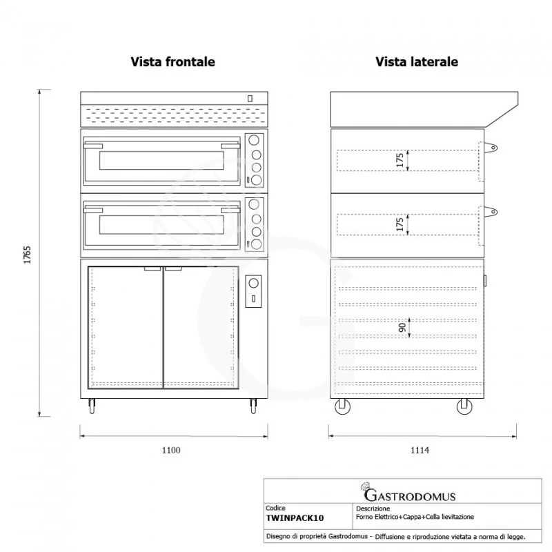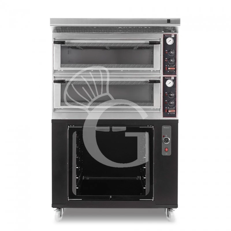 Forno Elettrico meccanico porta vetro 4 teglie 600×400 o 4+4 pizze Ø 400mm completo di cappa inox e cella di lievitazione nera.