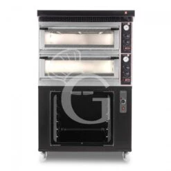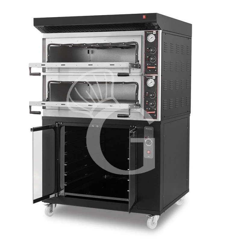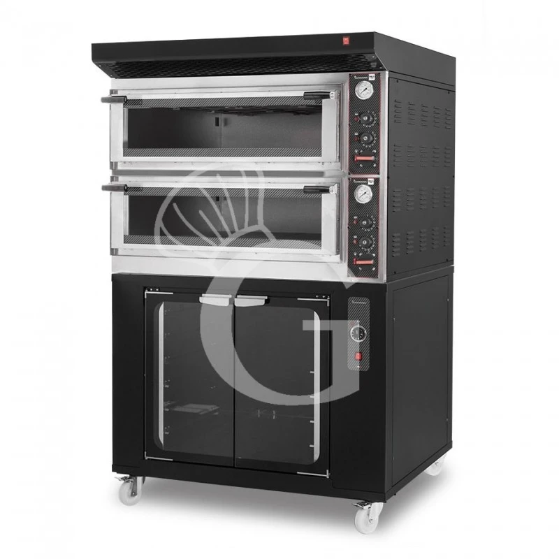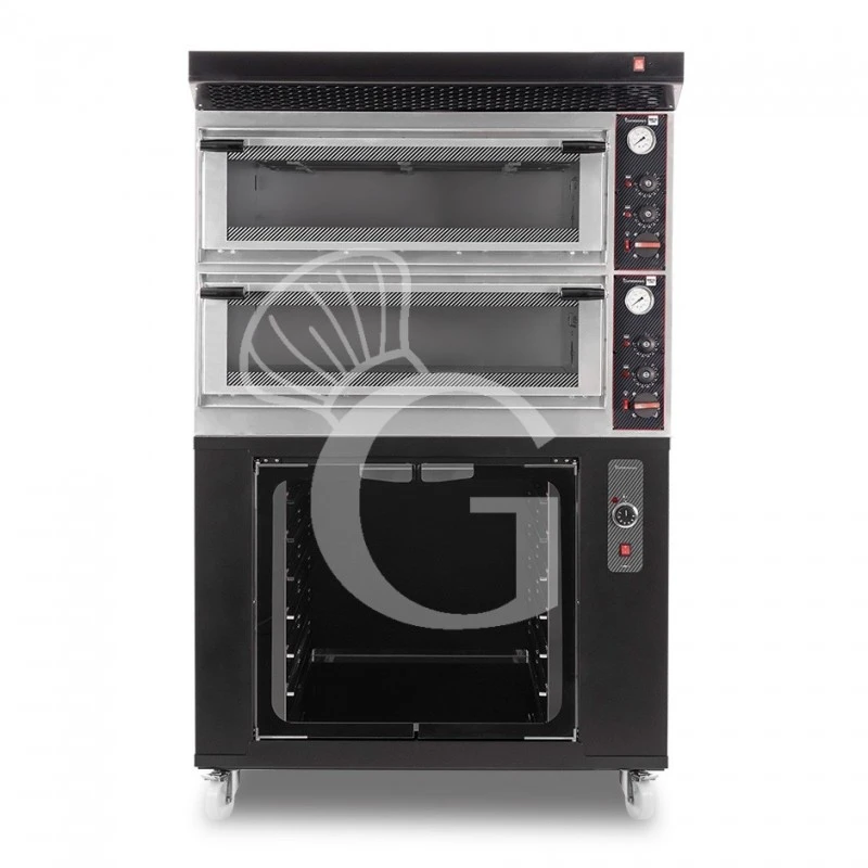 Forno Elettrico meccanico porta vetro 4 teglie 600×400 o 4+4 pizze Ø 400mm completo di cappa nera e cella di lievitazione nera.