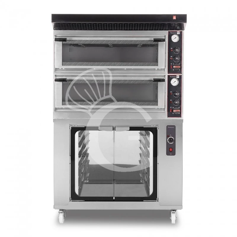 Forno Elettrico meccanico porta vetro 4 teglie 600×400 o 4+4 pizze Ø400, cappa nera e cella di lievitazione inox.