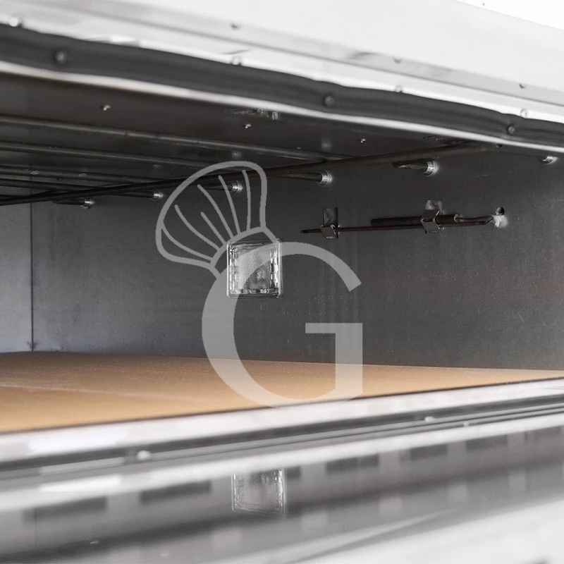 Il forno può essere utilizzato per ospitare 4 teglie (2 + 2) di dimensione 600 x 400 mm, oppure 12 pizze (6 + 6) del diametro di 350 mm.