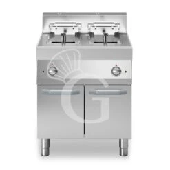 Friggitrice elettrica allestita su armadio chiuso con 2 vasche di capacità 10 litri + 10 litri.