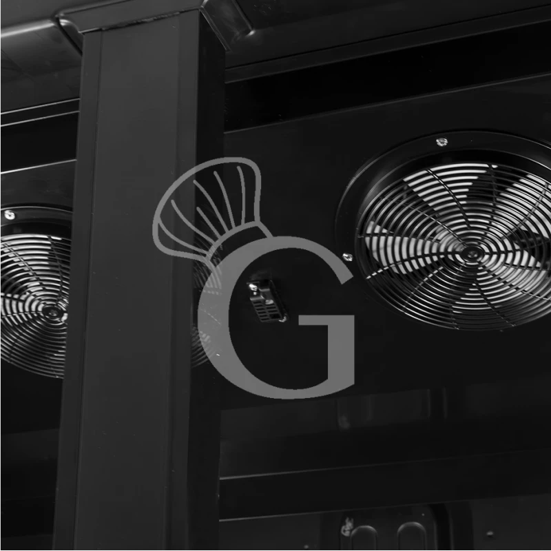 All’interno sono presenti 8 griglie con cremagliere e un sensore di apertura della porta che arresta la ventola a porta aperta.