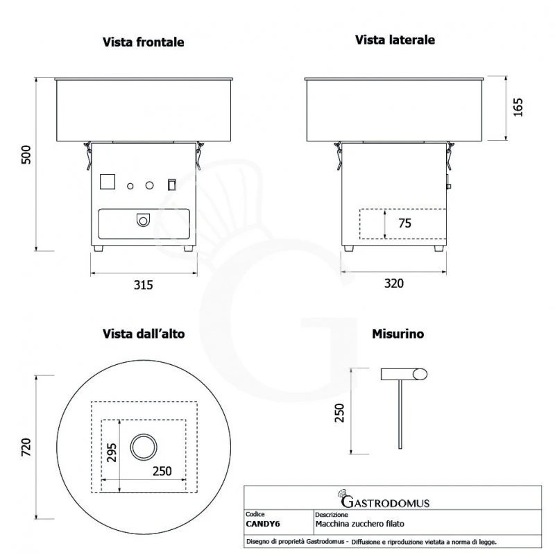 DIMENSIONI VASCA PER ZUCCHERO FILATO: DIAMETRO 720 mm E H 165 mm.