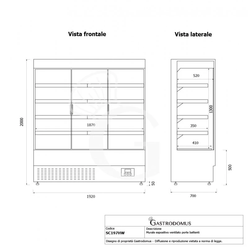 Il murale ha una refrigerazione ventilata con aggregato di raffreddamento interno alla macchina e una temperatura di esercizio che si attesta in un range positivo da -1°C a +7°C, con una temperatura ambiente compresa tra +25°C e un’umidità relativa del 60% RH. L’apparecchio presenta un’estesa area di esposizione distribuita in 8 ripiani di larghezza 350/410 mm realizzati in acciaio rivestito. La praticità di utilizzo è data inoltre dalla possibilità di regolare i ripiani in altezza. I ripiani possiedono poi espositori per etichette per poter esporre agevolmente il prezzo e le caratteristiche del prodotto.
