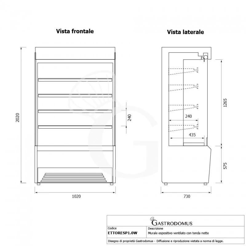 Murale espositivo Ettore con tenda notte con refrigerazione ventilata, temperatura +1°C/+10°C e lunghezza 1020 mm.