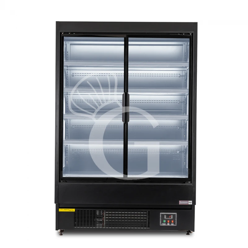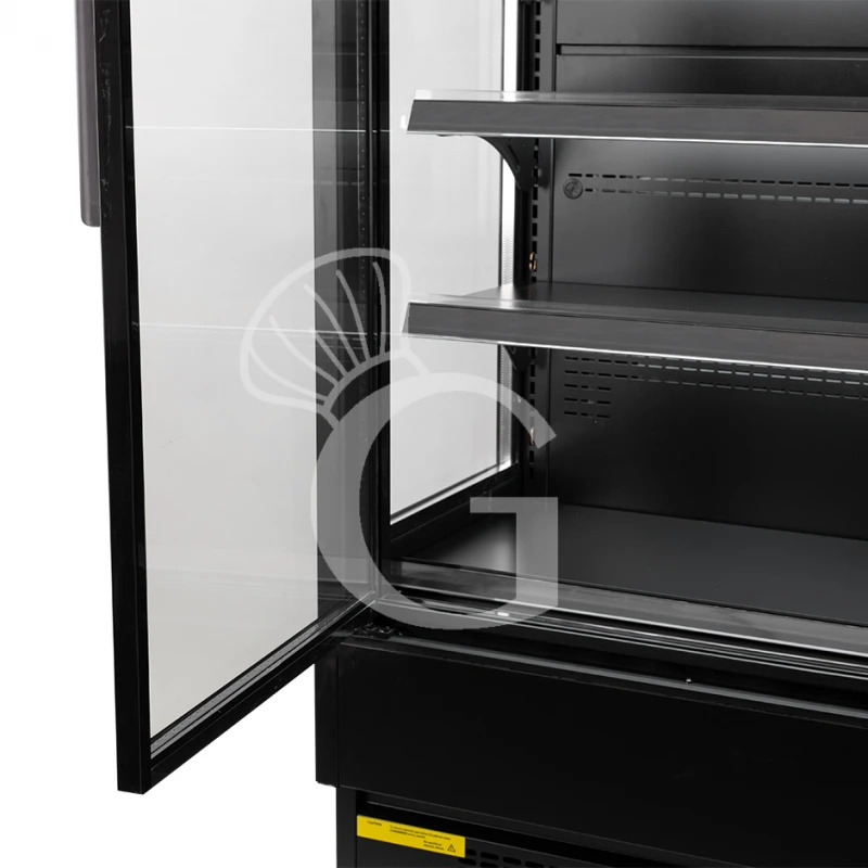 Murale espositivo ventilato nero con porte battenti, temperatura -1°C/+7°C e L 1315 mm.