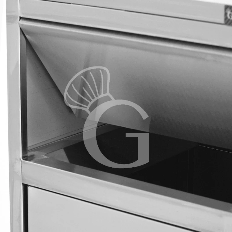 Ha una struttura in acciaio con 1 porta battente e sportello basculante che permette un pratico svuotamento dei vassoi.