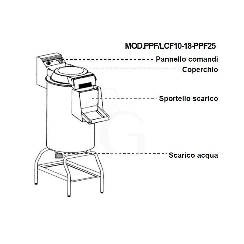 Pelapatate da pavimento con cavalletto, voltaggio monofase, capacità di carico patate e tuberi di 25 Kg, produzione 450 Kg all’ora.