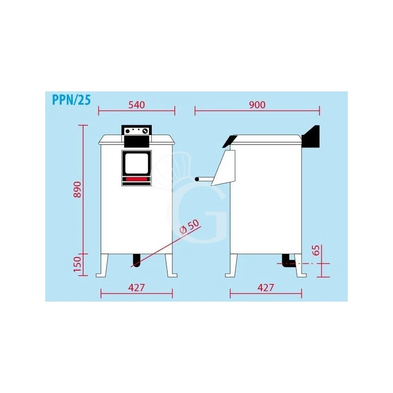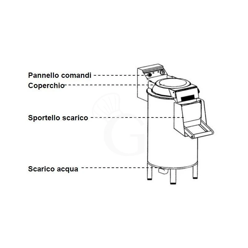 Pelapatate da pavimento, voltaggio monofase, capacità di carico patate e tuberi di 25 Kg, produzione 450 Kg all’ora.