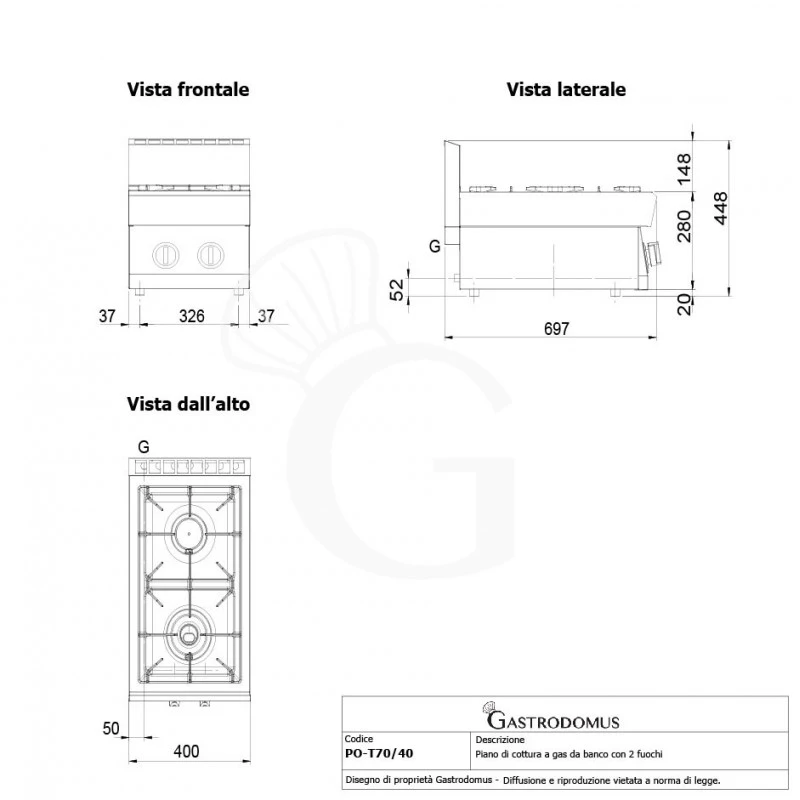L 400 mm x P 700 mm x H 280 mm - Profondità piano di cottura