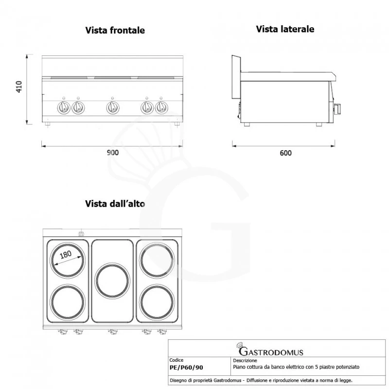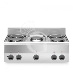 Il piano di cottura è dotato di 5 piastre elettriche in ghisa fissate ermeticamente al piano che hanno diametro di 180 mm e potenza di 2 Kw ognuna. Le piastre hanno inoltre bordo in acciaio INOX a tenuta e ogni piastra presenta un commutatore con 6 possibilità di regolazione della temperatura di lavoro.