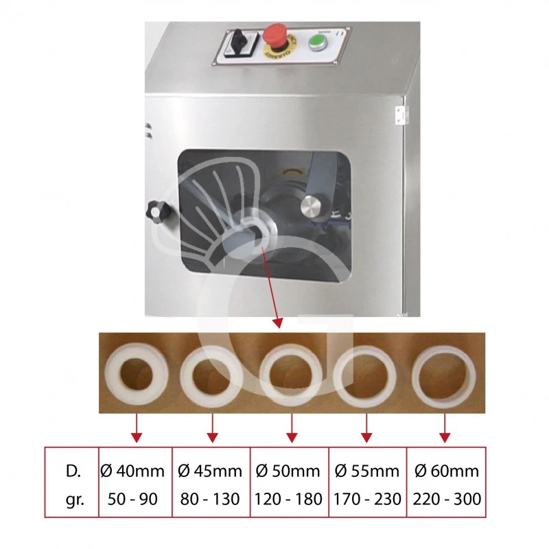 La grammatura desiderata può essere modificata andando a scegliere il cono con il diametro più indicato. Sul fondo dell’imbuto è presente una ghiera. Svitando questa ghiera si accede alla boccola di riduzione. Qui è possibile regolare la grammatura desiderata cambiando il cono. In dotazione con la macchina vengono forniti 5 coni con diversi diametri: 40, 45, 50, 55, 60 mm.