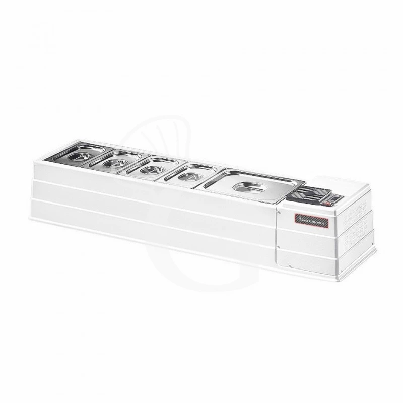 Refrigeratore da banco L 1270 mm x P 330 mm x H 230 mm, predisposto per 6 bacinelle GN1/4 H 150 mm OPPURE 1 bacinella GN 1/4 h 150 mm, 4 bacinelle GN 1/6 H 150 mm, 5 bacinelle GN 1/9 h 100 mm OPPURE 1 bacinella GN 1/2 H 150 mm, 4 bacinelle GN 1/4 H 150 mm.