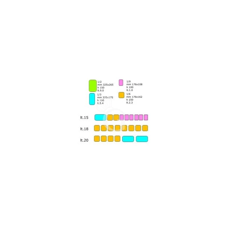 – 2 bacinelle GN 1/3 H 150 mm, 4 bacinelle da 1/6 h 150 mm (capacità totale 20 Litri)