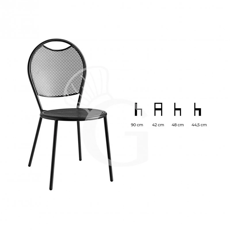 La struttura è alta 900 mm mentre l’altezza della seduta misura 445 mm. Inoltre è facilmente impilabile per un’ottima gestione degli spazi.