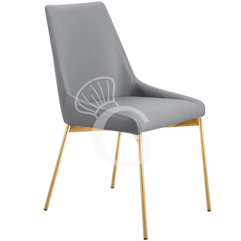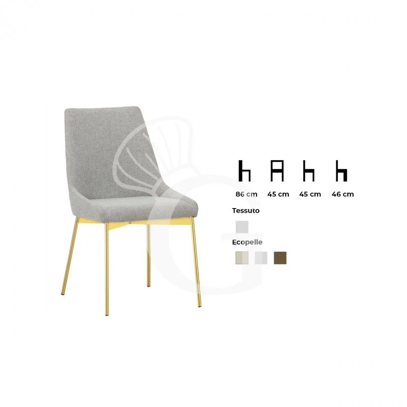 La sedia ha una struttura a quattro gambe in metallo color ottone satinato e un rivestimento compreso di seduta e schienale in elegante ecopelle o tessuto. Lo schienale e la seduta sono imbottiti.