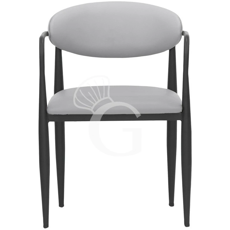 La sedia ha una struttura in metallo verniciato e seduta e schienale in ecopelle nei colori grigio chiaro e tortora.