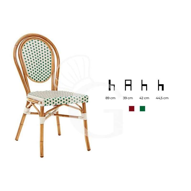 La sedia modello Molly ha una struttura in alluminio verniciato e bambù e seduta e schienale dello stesso materiale rivestiti in filo di nylon con decorazione a quadratini disponibile nei colori rosso e verde.