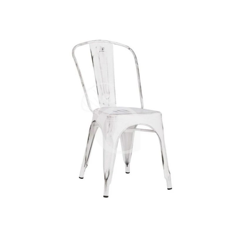 La sedia modello Piper ha l’intera struttura compresa di seduta e schienale in metallo verniciato con effetto usato, disponibile nei colori rosso, giallo, nero e bianco.