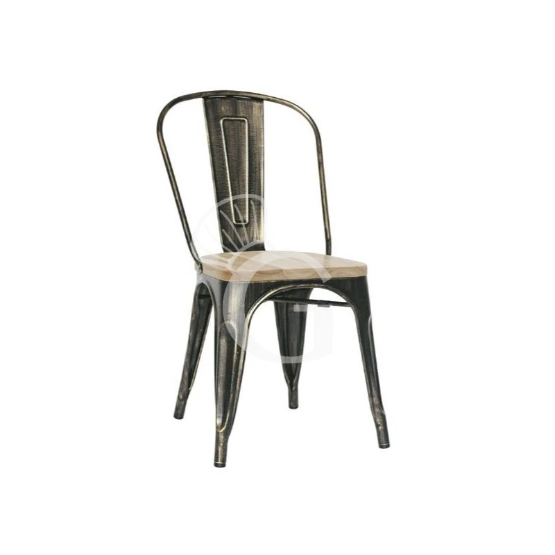 Sedia Rose con struttura e schienale in metallo verniciato effetto anticato e seduta in legno.