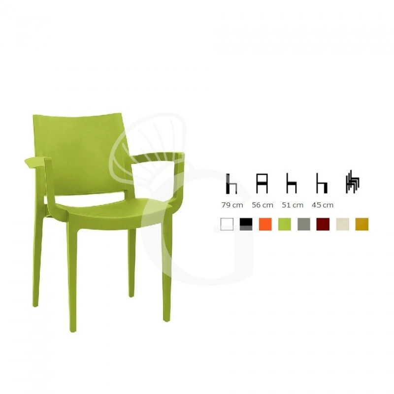 La struttura è alta 790 mm mentre l’altezza della seduta misura 45 mm. Inoltre è facilmente impilabile per un’ottima gestione degli spazi.