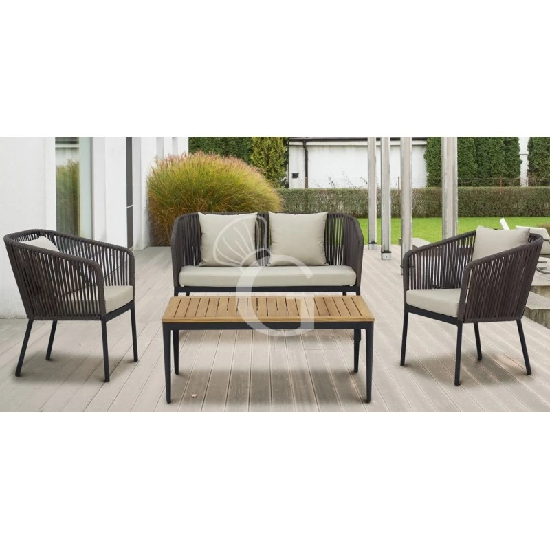 Tavolo rettangolare in alluminio verniciato e piano in teak, poltrone e divano con struttura in alluminio verniciato, rivestimento in piattina di polietilene, cuscini idrorepellenti.