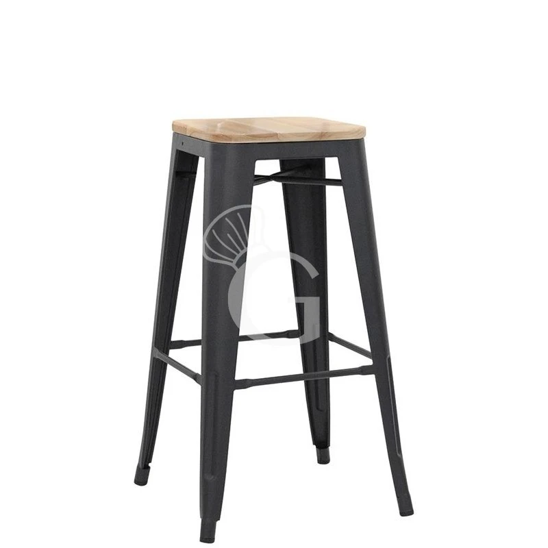 Sgabello Time con struttura in metallo verniciato e seduta in legno. Dimensioni L 300 mm x P 300 mm x H 760 mm.