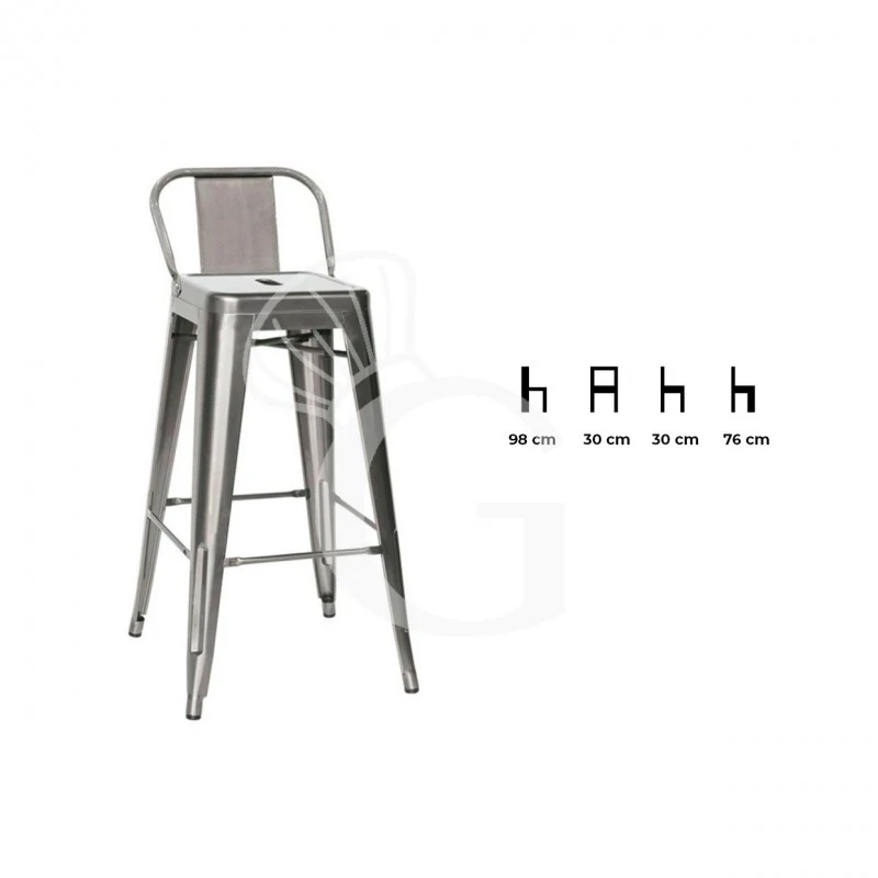 Sgabello Zac con struttura, seduta e schienale in metallo verniciato con vernice trasparente. Dimensioni L 300 mm x P 300 mm x H 980 mm.