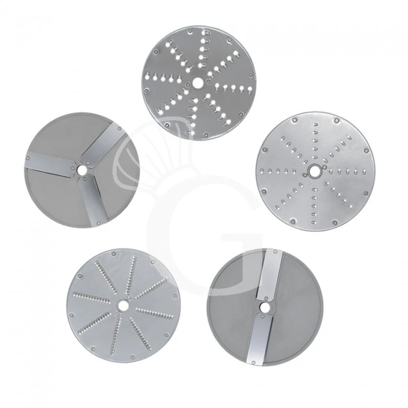 – kit 5 dischi (disco grattugia 7 mm, disco grattugia 4 mm, disco grattugia 3 mm, disco fette 4 mm, disco fette 2 mm);
