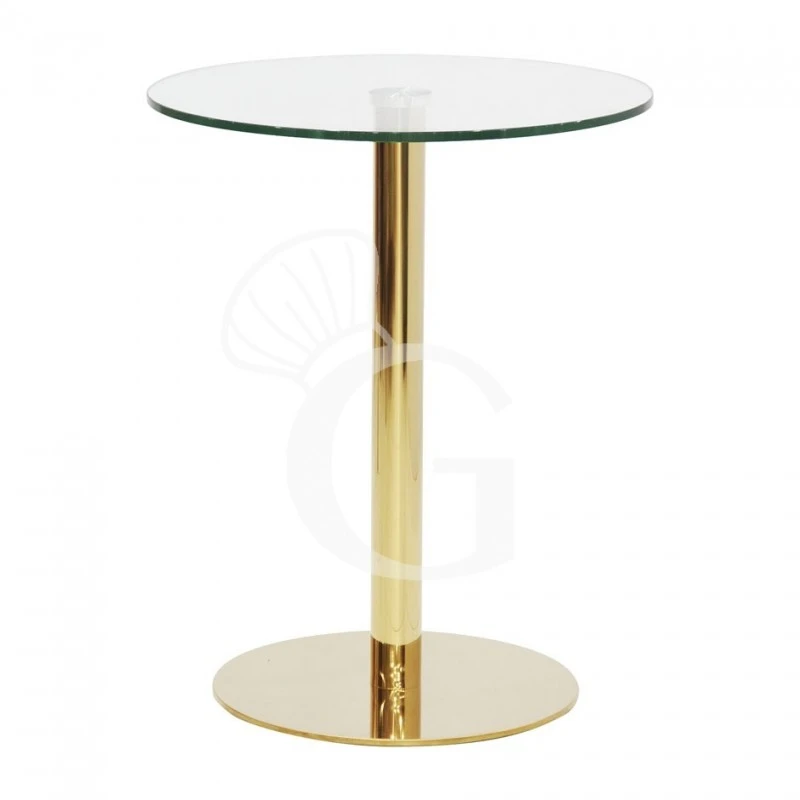 Tavolo in acciaio inox ottonato con piano in vetro temperato diametro 700 mm.