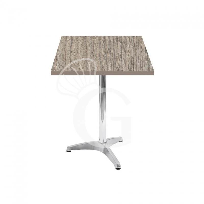 Tavolo completo di base quadrata con struttura in alluminio, piedini regolabili e piano quadrato in HPL Grey wood.