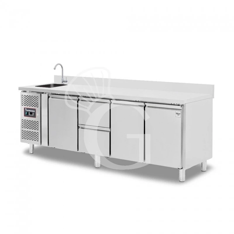 Tavolo lavello armadiato refrigerato provvisto di 2 cassetti 3 porte con alzatina, profondità 700 mm, temperatura +2°C/+8°C– rubinetto Ø 25 mm.