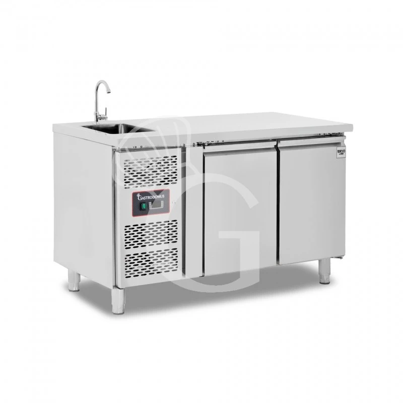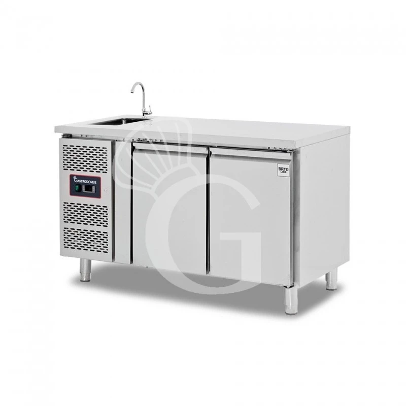 Tavolo lavello armadiato refrigerato provvisto di 2 porte, profondità 700 mm, temperatura +2°C/+8°C, motore a sinistra – rubinetto Ø 25 mm.