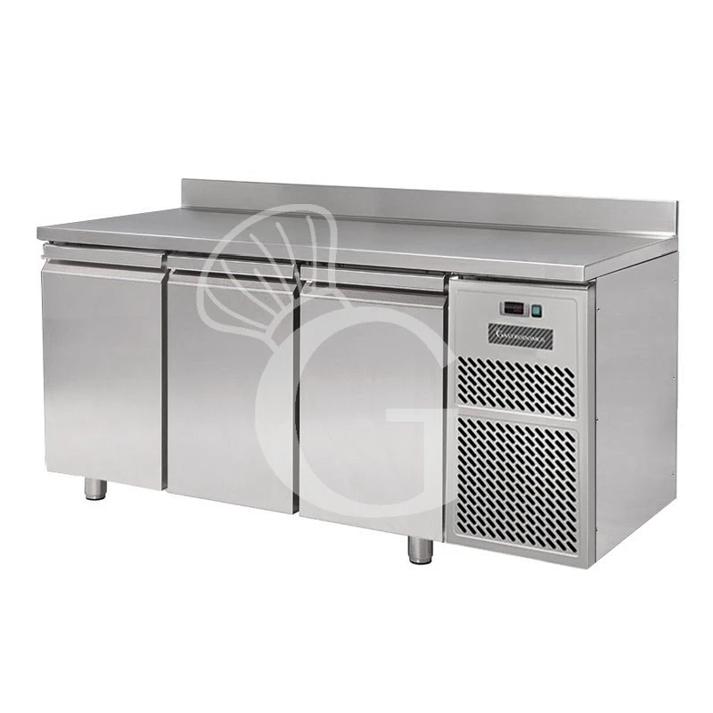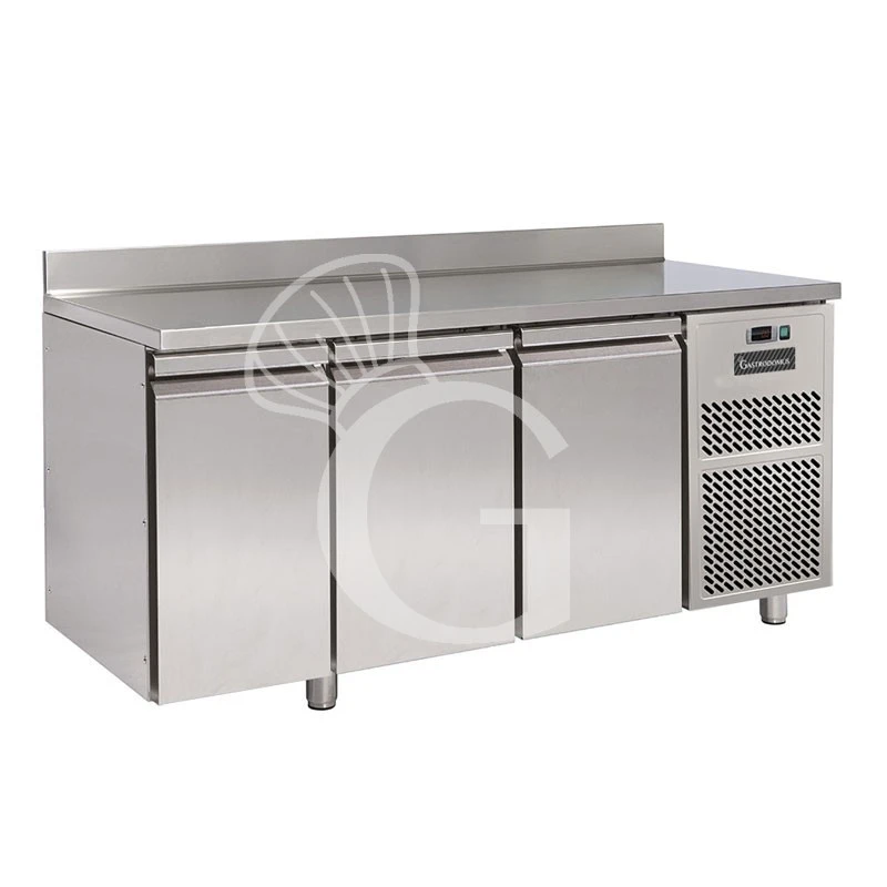 Tavolo refrigerato con 3 porte e alzatina, profondità 800 mm e temperatura 0°C/+10°C.