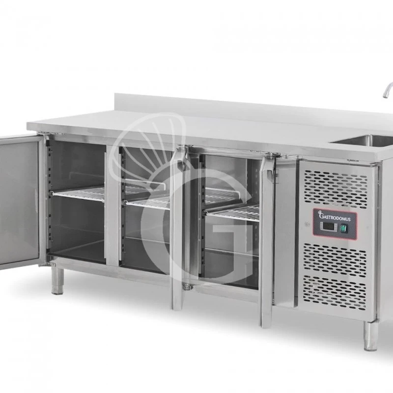 Tavolo lavello armadiato refrigerato provvisto di 3 porte con alzatina, profondità 700 mm, temperatura +2°C/+8°C– rubinetto Ø 25 mm.