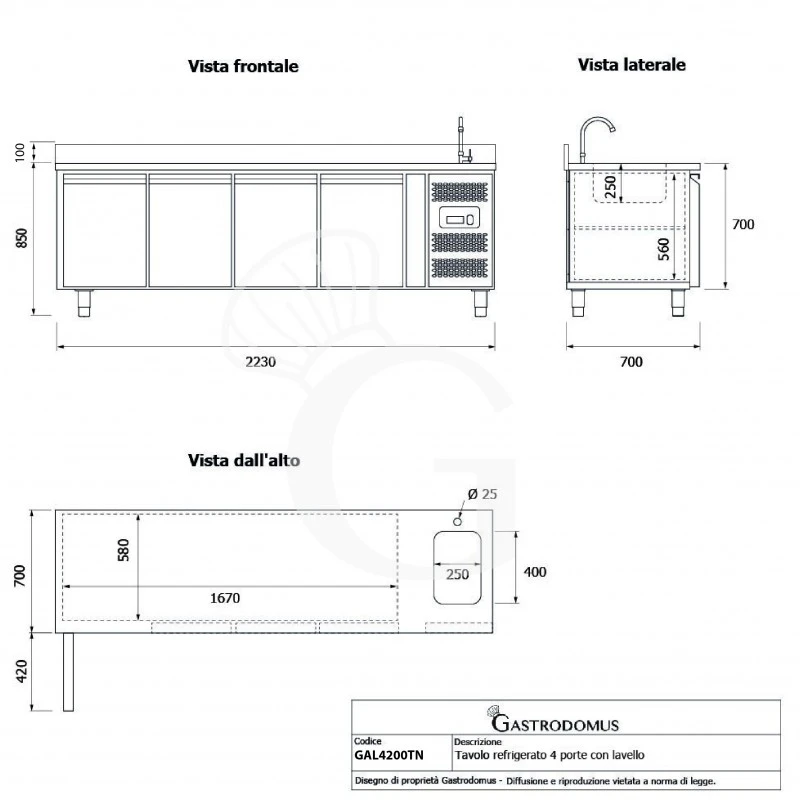Il motore del tavolo refrigerato e il lavello sono situati sulla destra.