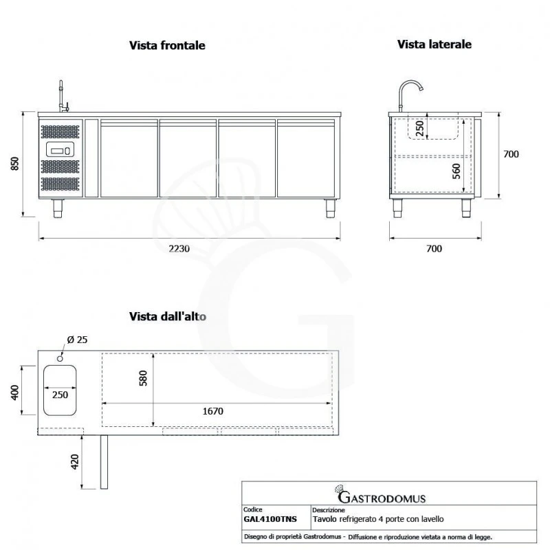 Il motore del tavolo refrigerato e il lavello è situato sulla sinistra.
