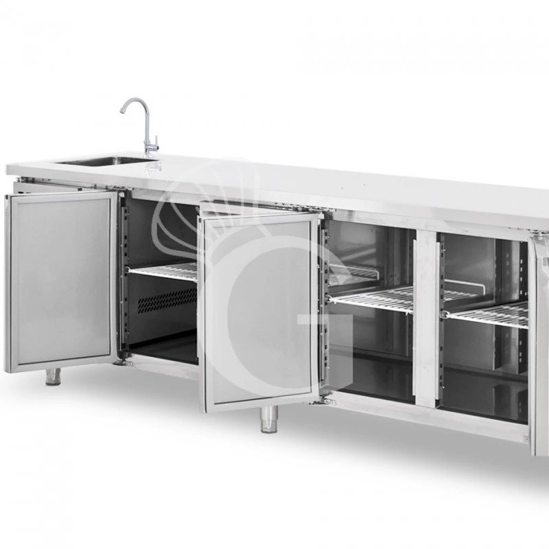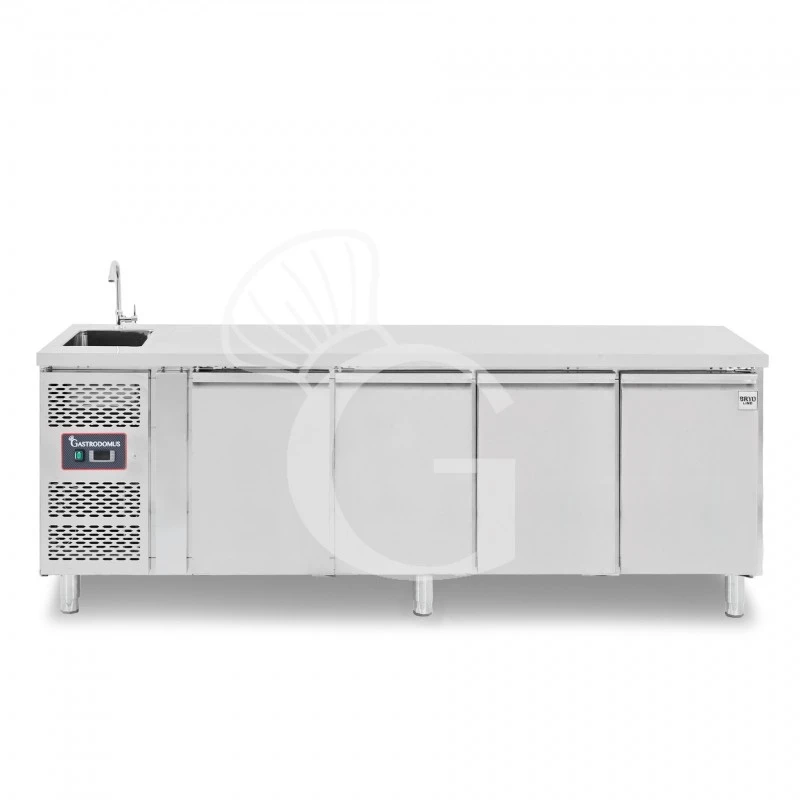 Tavolo lavello armadiato refrigerato provvisto di 4 porte, motore a sinistra, profondità 700 mm, temperatura +2°C/+8°C – rubinetto Ø 25 mm.