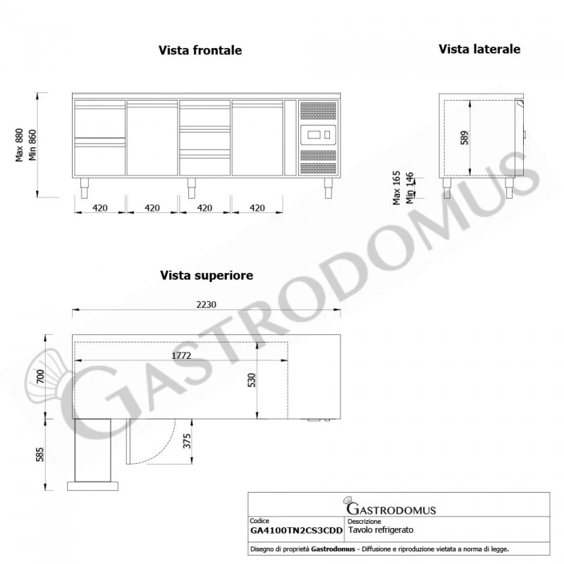 L 1772 mm x P 530 mm x H 589 mm - Profondità tavolo refrigerato