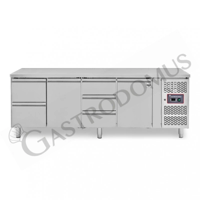 Tavolo refrigerato provvisto di 2 porte, 2 cassetti sinistra da 1/2 e 3 cassetti centrali destra da 1/3 profondità 700 mm, temperatura -2°C/+8°C.