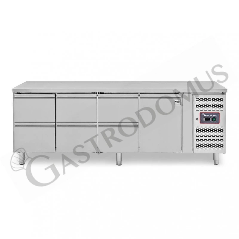 Tavolo refrigerato provvisto di 1 porta e 6 cassetti sulla sinistra da 1/2, profondità 700 mm, temperatura -2°C/+8°C.