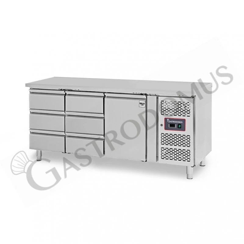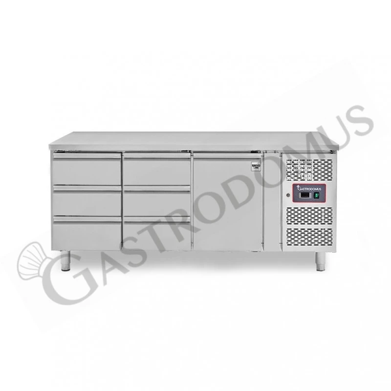 Tavolo refrigerato provvisto di 1 porta e 6 cassetti sulla sinistra da 1/3, profondità 700 mm, temperatura -2°C/+8°C.