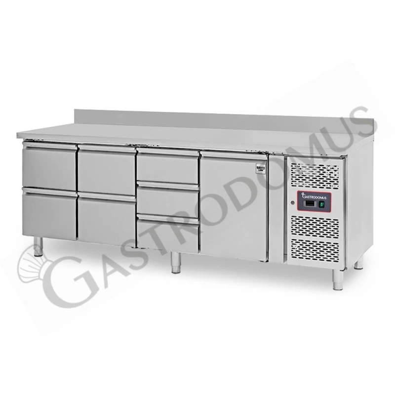 Tavolo refrigerato provvisto di 1 porta, 2 cassetti sinistra da 1/2 e 2 cassetti da 1/2 + 3 cassetti centrali da 1/3, con alzatina, profondità 700 mm, temperatura -2°C/+8°C.
