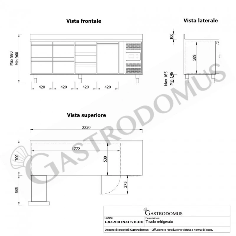 L 1772 mm x P 530 mm x H 589 mm - Profondità tavolo refrigerato